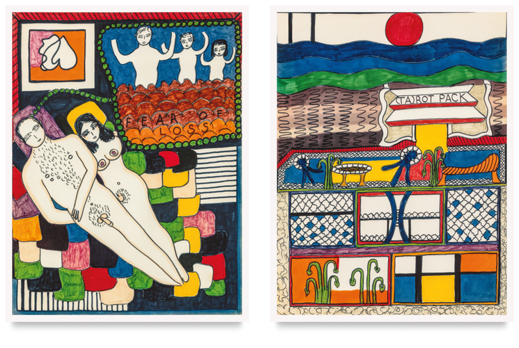 This series of 27 double-sided cards depicts the life of Dieter Roth, Dorothy Iannone’s beloved and muse, in the early period of their relationship. During 1968–69, Iannone worked on the cards while they were living in Düsseldorf where Dieter was professor at the Kunstakademie. The original drawings were censored during the exhibition Friends curated by Harald Szeemann at the Kunsthalle Bern in 1969.